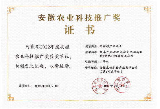 安徽省2022年度安徽農業科技推廣獎二等獎-Y兩優17